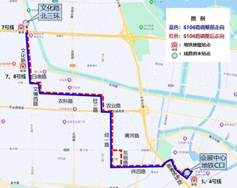 途经道路调整为:文化路、白庙路、文博西路、农科路、经三路、农业路、经一路(下行:黄河路、东明路)、纬四路、商务外环路、商务西七街、商务内环路、商务西八街。